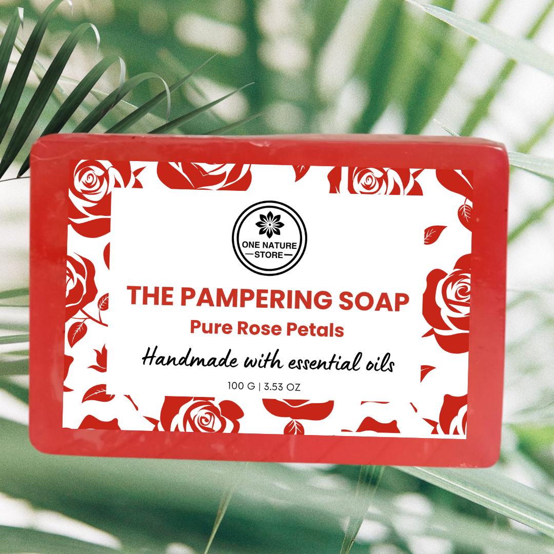 One Nature Store's - The Pampering Soap is a luxurious soap infused with the romantic infusion of fresh rose extracts, offering a pampering bath experience that leaves your skin soft and delicately scented. Helps prevent from sulphates stripping skin of natural oils, and artificial fragrances causing irritation.
